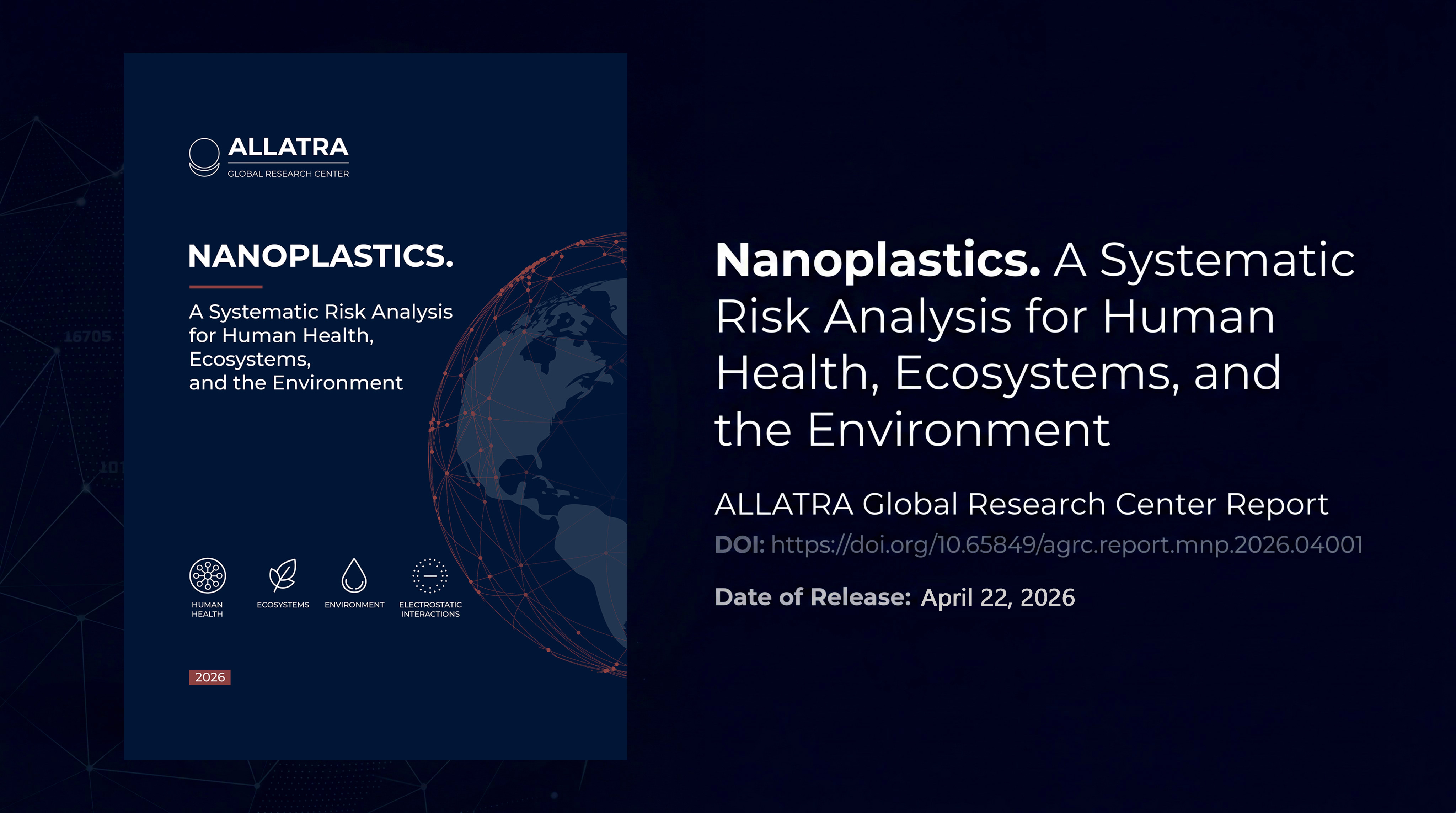 WASHINGTON, DC, UNITED STATES, April 23, 2026 /EINPresswire.com/ -- ALLATRA Global Research Center, a U.S.-based international think tank, announces the release of a new scientific and analytical report, “Nanoplastics. A Systematic Risk Analysis for Human Health, Ecosystems, and the Environment.” The work is distributed under a CC BY 4.0 license and is intended for use by the scientific community, regulatory authorities, policy institutions, and the general public. The publication has been assigned the DOI: https://doi.org/10.65849/agrc.report.mnp.2026.04001 and is available on the Center’s website.The report “Nanoplastics. A Systematic Risk Analysis for Human Health, Ecosystems, and the Environment” is unique in that it goes beyond data on the scale of plastic pollution or individual harmful effects. It helps clarify the central issue: what specifically makes nanoplastics so active in their interactions with living systems, including the human body.